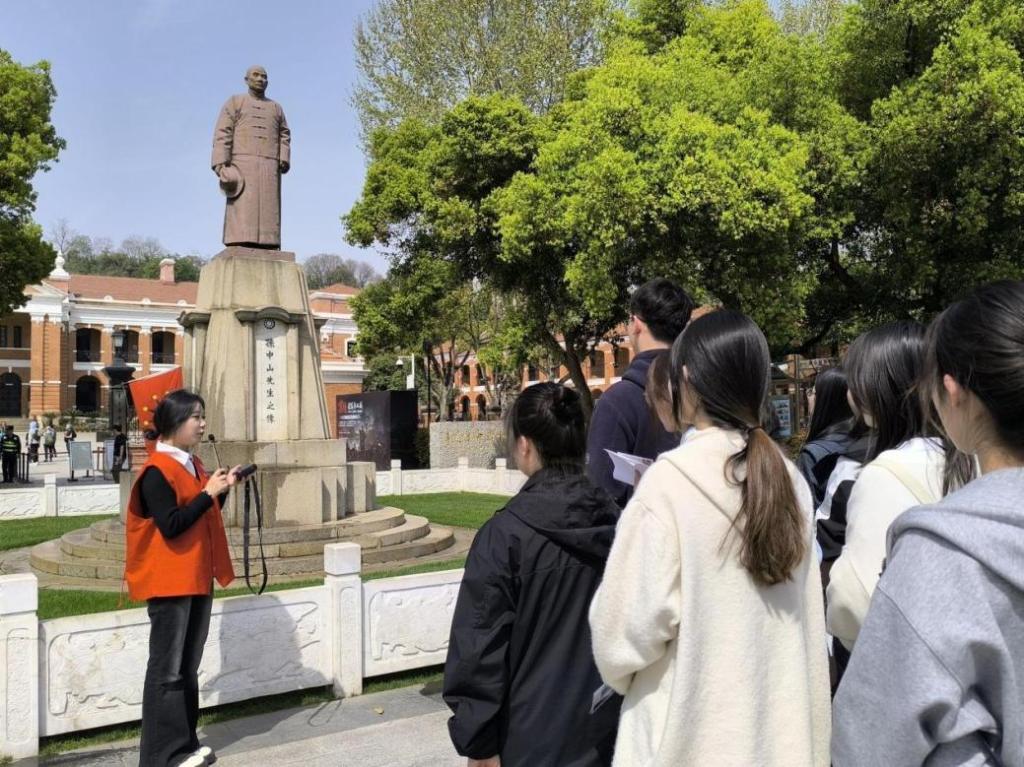 研学第一站,师生们来到孙中山先生铜像前。旅游管理专业学生杨盼发挥专业特长,为现场师生和游客们进行开放式讲解。30余名青年学子在铜像前列队肃立,齐声诵读《少年中国说》片段。随着领诵员一声清亮的“故今日之责任,不在他人,而全在我少年”,铿锵有力的诵读声骤然响起,青年们的声音如黄鹤楼上冲霄的鹤唳,又似长江奔涌的浪涛,瞬间点燃了现场氛围。