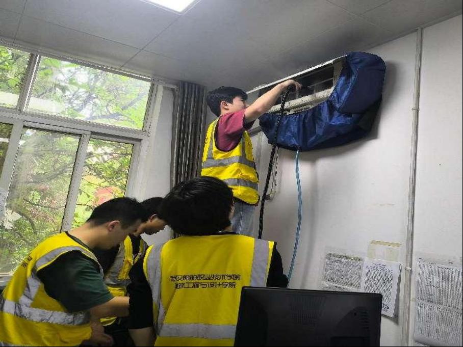 黄丽老师认真强调了安全和规范性操作的注意事项,同学们随后分组进行空调清洗,切断电源、拆卸空调外壳,取出滤网,对空调内部进行深度清洁……大家分工明确,配合默契,每个步骤都认真细致,两小时内完成了多间办公室的空调清洗,在场老师纷纷点赞暖通专业学子踏实、认真的工作态度和助人为乐的志愿服务精神,同学们也在服务中磨炼了技能、感悟劳动价值。
