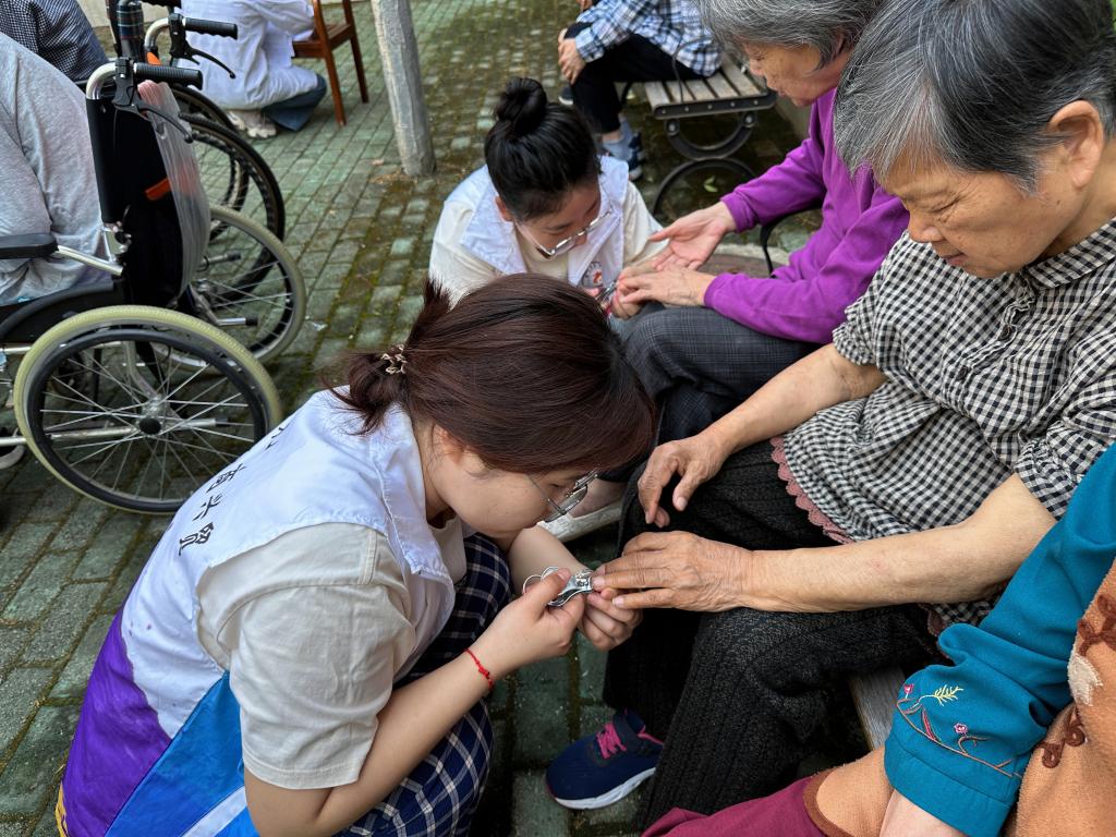 与此同时,另一组学生则带来文艺表演,《甜蜜蜜》《外婆的澎湖湾》等经典歌曲引发共鸣,老人们或轻声和唱,或闭目回味,现场洋溢着温馨氛围。现场另一侧,“理发修甲摊”同步开展服务。学生们手法娴熟地为老人修剪头发、指甲,根据老人需求设计发型,俯身服务行动不便者,每一个动作都传递着关怀与尊重。活动接近尾声,学生们将亲手制作的平安符送到每位老人手中,平安符上绣着“健康平安” 的字样,寄托着他们最真挚的祝福。老人们接过平安符,紧紧握住志愿者的手,眼中满是感动。