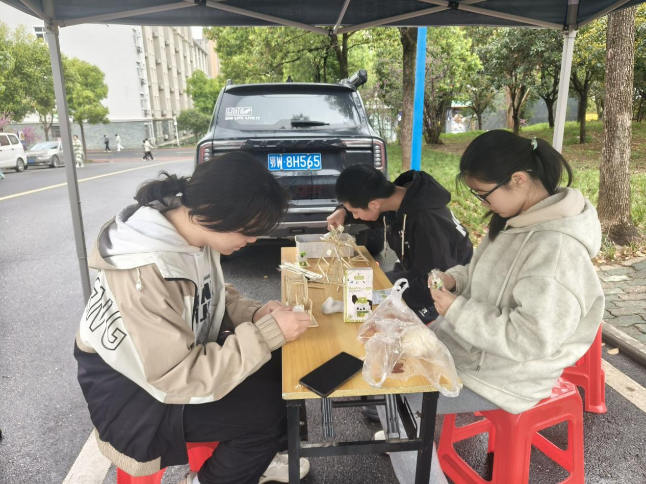 早上八点,志愿者们抵达活动现场,迅速搭建起帐篷,随着雨势渐缓,活动正式开始。在主干道两侧的展示桌上,陈列着竹棍手工艺品和纸壳承重模型,志愿者们展示着用筷子拼接的微型庭院以及“摩天轮”,吸引路过的同学前来参与。