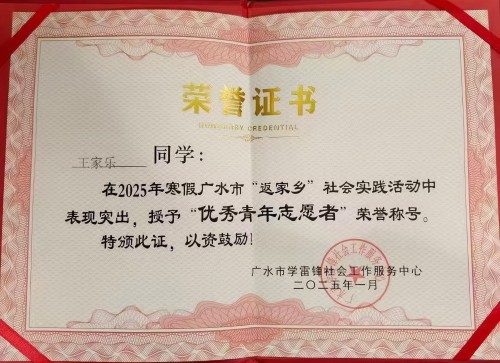 他还作为广水市"学雷锋"志愿者团队的一员,积极参与"寒假学堂"公益活动,不仅为20余名留守儿童辅导功课,还设计出趣味手工、将自身的专业知识融入游戏教学。“王哥哥的课像魔法一样!”一名留守儿童在手工课兴奋地说道。元宵节期间,协助了社区元宵晚会的节目编排与舞台拍摄任务。当天,广水融媒体记者按下快门的瞬间,镜头里不仅有腾跃的金色龙狮,还有王家乐手持云台、额头沁汗的侧影。他在广水市“返家乡”社会实践中表现突出,荣获“优秀青年志愿者”荣誉称号。