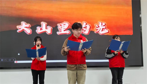 诗朗诵《大山里的光》以时代楷模张桂梅老师为原型,通过“马蹄声碎”“烛光摇曳”等意象,再现乡村教育工作者的奉献情怀。朗诵者的深情演绎将现场气氛推向高潮,当“只要还有一口气,就要站在讲台上”的诗句响起时,现场师生们与朗读者的情感“同频共振”,深切体会到教育扶贫与志愿精神的伟大。
