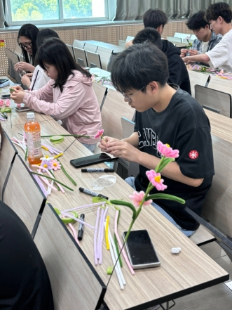 活动中,来自22、23级的40位同学积极参与创作。同学们专注地用扭扭棒折出色彩斑斓的花朵,仔细对照着折花教程,力求每一片花瓣都精致完美。同学们还精心挑选春日干花、银杏叶和各类树叶,将它们放入透明标本瓶,打造出“瓶子里的春天”。现场讨论声与欢笑声交织,同学们在动手实践中感受春日生机,同时增进了彼此的情谊。