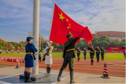 在庄严的国歌声中,五星红旗冉冉升起,全体师生肃立齐唱,爱国情怀与体育精神在运动场上交相辉映。