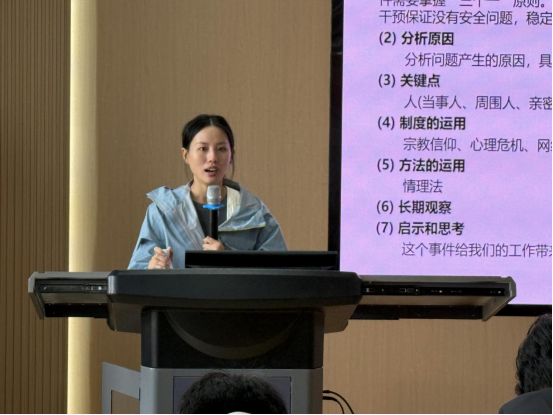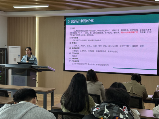 徐一菱老师结合自身参赛经历与工作实际,从备赛策略与实务能力提升两个维度展开分享。她指出,备赛应与日常工作紧密结合,实现“以赛代练、以练促育”的良性循环。在案例分析环节,徐老师系统阐述了“四步解题法”:即优先处理紧急问题、抓准关键人物与事件、教育与管理双线推进、融入政策理论进行总结升华,并提出“启示提问、总结聚焦、查缺补漏、拔高提升”四大提问技巧,为辅导员提供了清晰的结构化思维工具。在谈心谈话方面,她强调日常积累的重要性,归纳出五大实践原则,助力辅导员将日常交流转化为育人契机。
