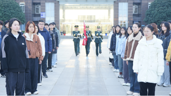 我校国旗护卫队举行了庄严的升国旗仪式,他们手持国旗,踏着整齐的步伐走向旗台,我院学生左右侧身45度面向国旗,行注目礼,国歌响起,国旗随之缓缓升起。