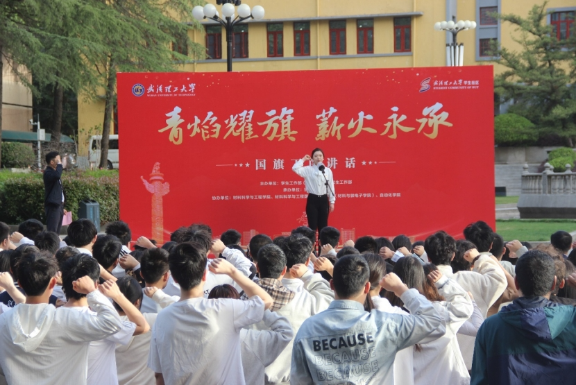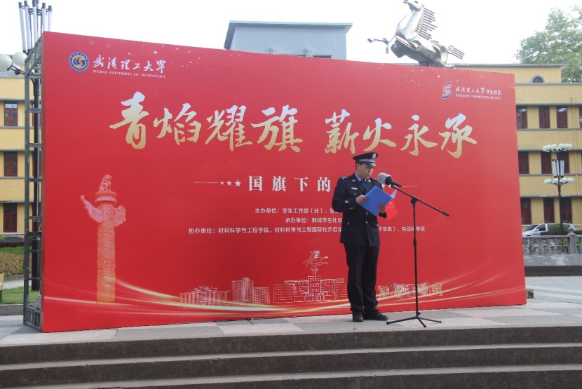 在五四青年节到来之际,为深植“清澈的爱,只为中国”的赤子情怀,增强学生的民族自豪感和责任感,4月14日上午,武汉理工大学狮城学生社区举行“青焰耀旗・薪火永承”主题国旗下的讲话活动。狮城学生社区副区长、党委研究生工作部副部长田仕,马房山派出所林曦警官,材料学院、材料示范学院、自动化学院领导班子成员以及200余名研究生、本科生代表参与活动。材料学院党委副书记沈国芳主持活动。