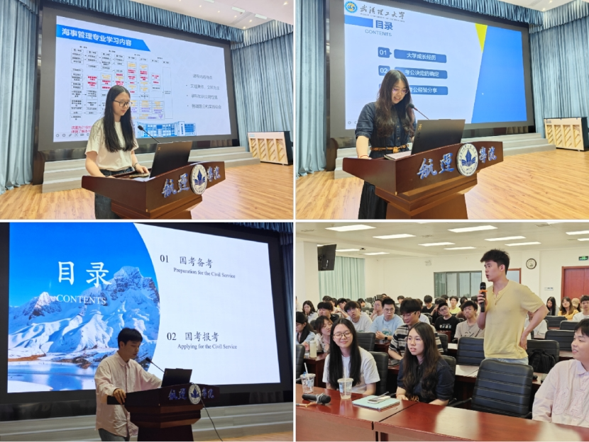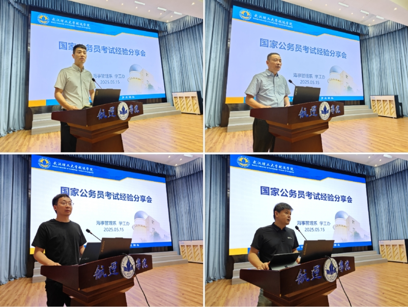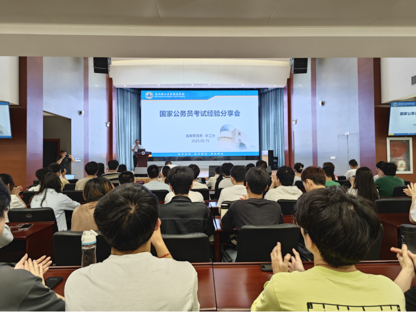 5月16日,武汉理工大学航运学院海事管理系联合学生工作办公室在海虹学生社区天象馆一楼报告厅召开国家公务员考试经验分享会,2025届国考高分学生叶芸、周叶子、颜智彬作经验分享。学院党委副书记王树鹏、海事管理系主任翁建军、系年轻教师刘奕、张帆、袁智以及2022级、2023级海事管理专业全体学生参加本次分享会。会议由海事管理系主任翁建军教授主持。