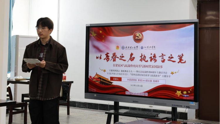 在核心研读环节,师生共同诵读了《习近平的七年知青岁月》中关于“扎根基层”“攻坚克难”的章节,从字里行间感悟习近平总书记青年时期的奋斗精神与为民情怀。随后的主题分享环节,外国语学院2024级张啸宇同学结合外语专业特色,以“用外语讲好知青故事与抗战故事”为题,分享了如何运用语言优势向世界传播中国红色故事、展现真实立体全面的中国形象的思考与感悟,展现了外语学子的文化自信与传播使命;信息学院代表同学则从“科技报国与青年责任”角度分享了学习体会。在互动研讨环节中,同学们围绕“抗战精神如何滋养新时代青年成长”及“‘四史’学习与专业发展的结合点”等议题展开了热烈讨论,在思想碰撞中进一步凝聚了共识,明确了方向。
