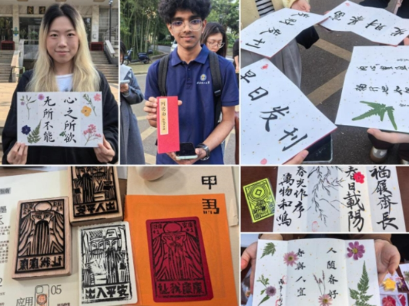 活动吸引了不同身份的师生参与。马克思主义学院大二学生叶同学暖心分享,恰逢生日参与活动,亲手创作的拓印与植物手作,成为最珍贵的春日礼物。一位外籍研究生在体验拓印、书法后,还特意请协会同学用毛笔在册页封面写下自己的中文名字,称这是一次直观而生动的文化接触。资源与环境工程学院的刁老师在沉浸式体验后,还与馆员深入交流了图书荐购、电子资源使用等问题,表示在享受文化熏陶的同时也解决了实际需求,收获颇丰。