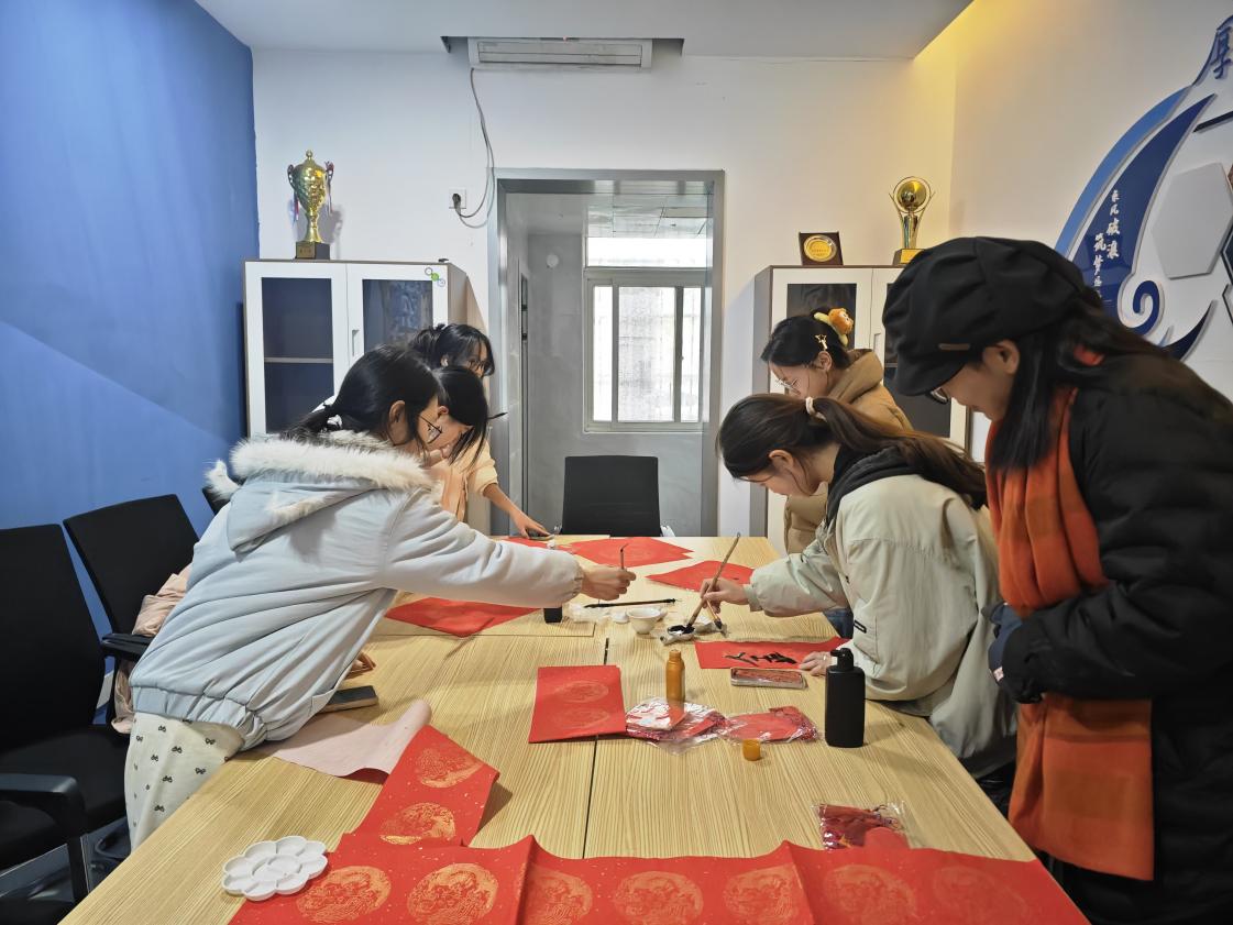 活动现场,热闹非凡。五彩斑斓的花灯制作材料整齐地摆放着,同学们热情高涨,纷纷动手,发挥自己的创意。有的同学专注于裁剪纸张,有的则细心地拼接花灯骨架,在大家的共同努力下,一盏盏造型独特、精美绝伦的花灯逐渐成形。与此同时,写福字的区域也吸引了众多书法爱好者。同学们手持毛笔,饱蘸墨汁,在红彤彤的纸上挥毫泼墨,一个个苍劲有力、饱含祝福的“福”字跃然纸上。现场欢声笑语不断,洋溢着浓浓的节日氛围。