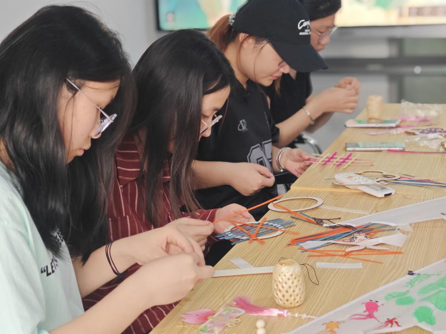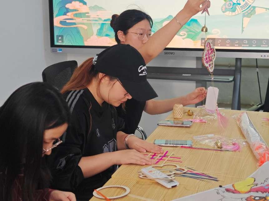 在手绘风筝环节,传统吉祥纹样成为创作主角。同学们勾勒醒狮,寓意“醒狮点睛,镇宅纳福”;绘制锦鲤,再现“鱼跃龙门”的美好愿景;描绘谷雨图景,将柳枝、燕子等节气元素融入画面;用竹片编制竹风铃,用五彩丝线串联起纸鸢造型的吊饰,同学们用制作手工的方式续写新的春日叙事。