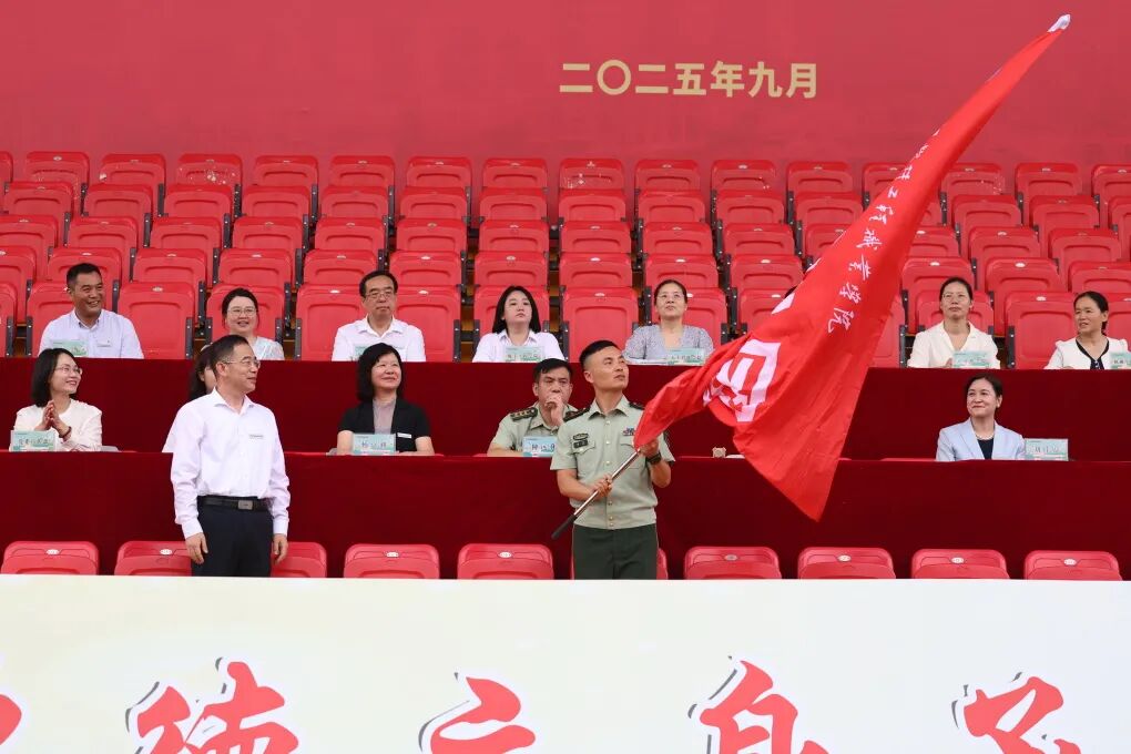 授旗仪式上,校党委书记蒋兴鹏向承训部队授予军训团团旗。这面旗帜,不仅标志着新生军训的正式启动,更象征着 “磨砺意志、锤炼品格” 的第一课,即将在武软校园拉开帷幕。