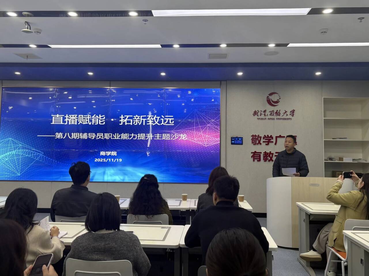 (通讯员 方立)11月19日上午,由学校党委学生工作部主办、商学院承办的第八期辅导员职业能力提升主题沙龙在商学院电商产业学院顺利举行。本次活动以“直播赋能·拓新致远”为主题,聚焦直播电商新业态,探索辅导员队伍建设与育人模式创新的有效路径。