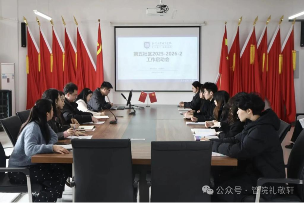 为进一步推动“一站式”学生社区建设迈上新台阶,2026年3月19日,武汉商贸职业学院第五社区“礼敬轩”新学期工作启动大会在管理楼616顺利召开。本次大会由指导老师章文彬主持,校团委书记、社区主任(行政)李珊,管理学院党总支副书记、第五社区主任佘世诚做动员讲话。各站点负责人总结汇报未来规划,全体成员参会,共同为新学期学生社区工作明确了目标,理清思路。