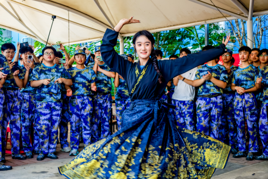 计算机科学与技术学院的维吾尔族新生凯迪日耶·卡依沙尔现场跳起民族舞蹈(摄影贺爱馨)