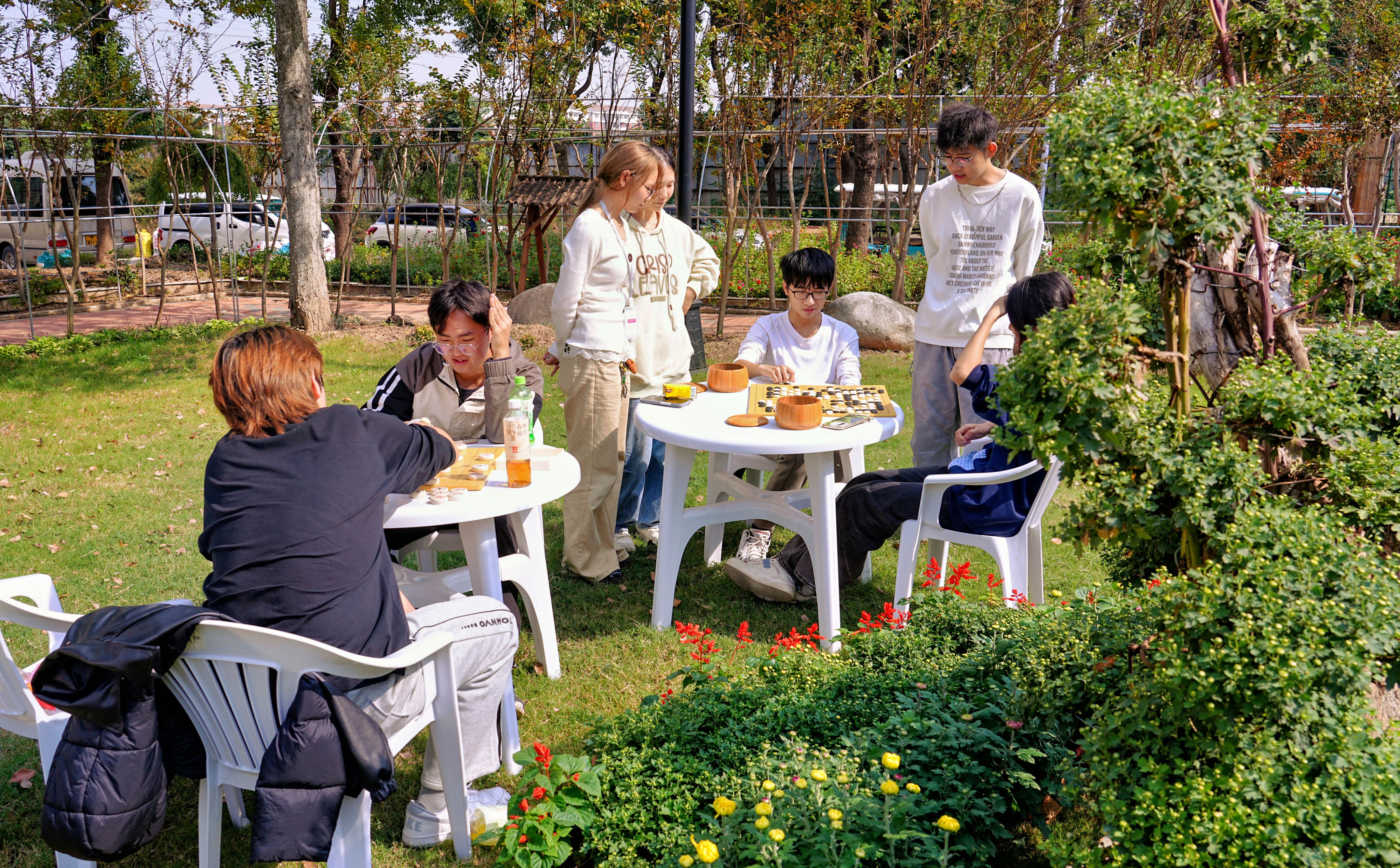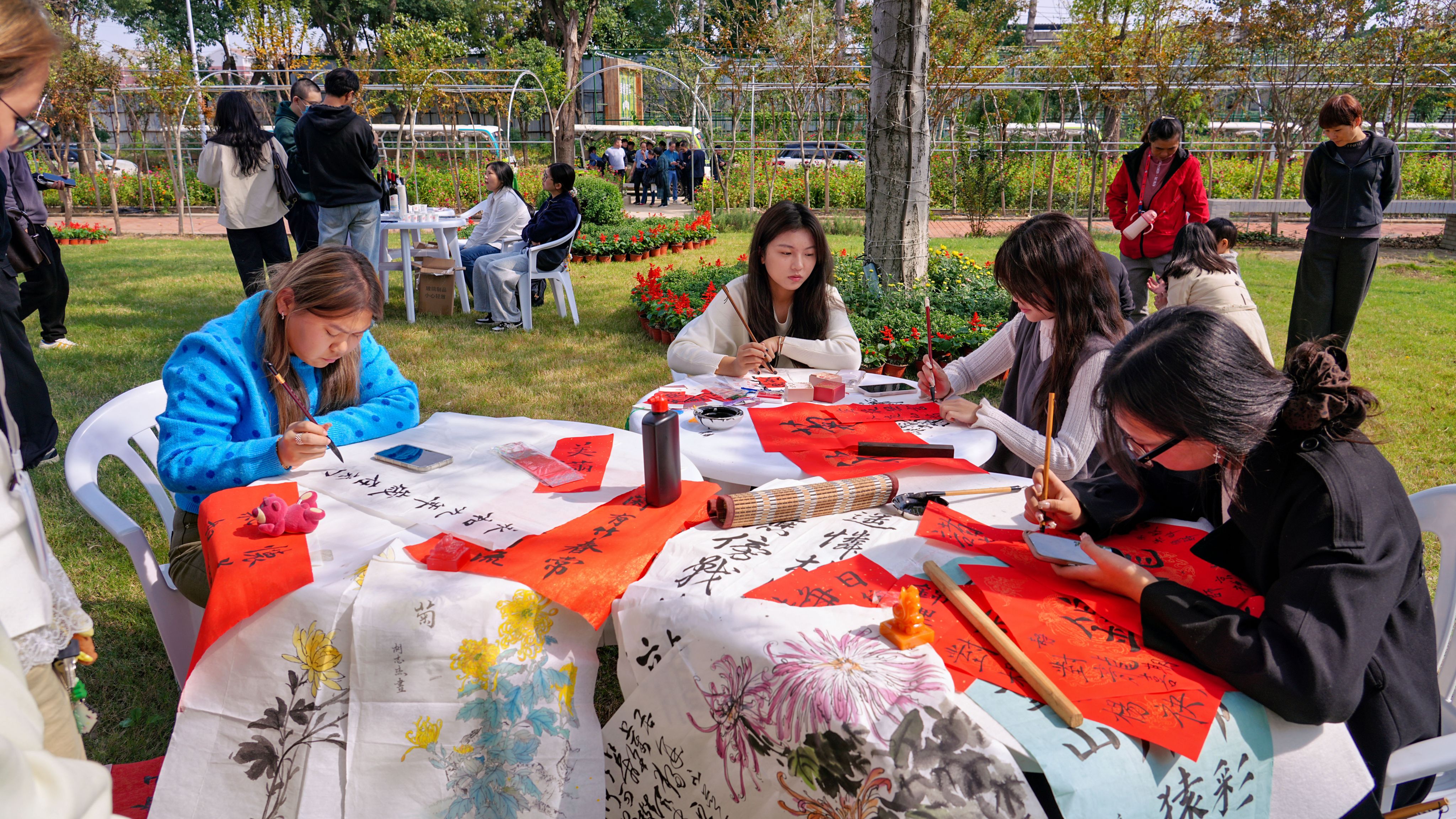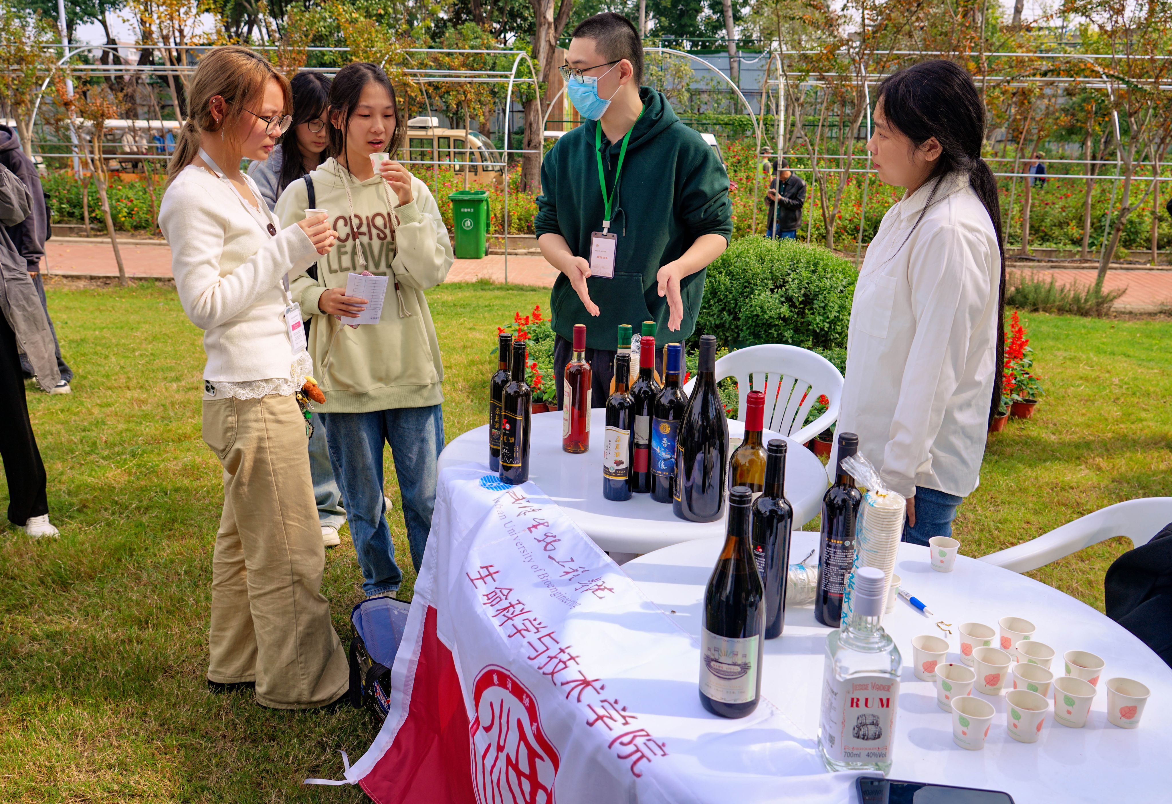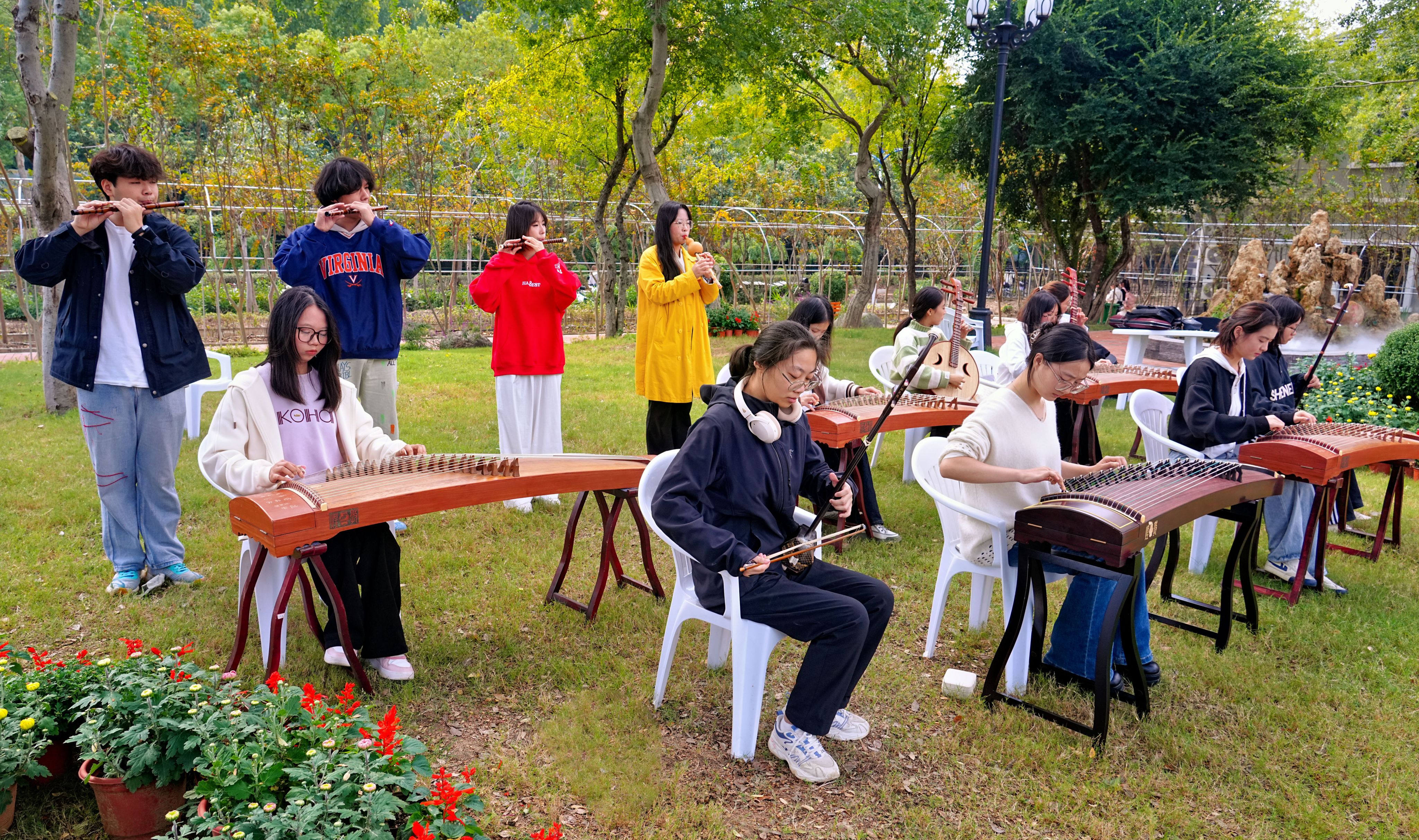 大健康学产研基地薇香玫语园里,各色菊花沿小径次第铺展,民乐协会的学生端坐于菊丛间,指尖拨动琴弦,悠扬旋律随风飘扬;书画社的学生以菊为景,在宣纸上挥毫泼墨,勾勒出菊花的千姿百态;茶社的同学烹水煮茶,棋社成员专注对弈,颇有一份悠然雅致。现场还有果酒酿造实训中心自制的桑葚酒,同学们一边赏菊,一边浅酌桑椹酒,感受着重阳佳节与校园科研成果的独特融合,别有一番风味。