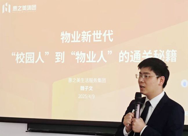 魏子文以“行业趋势”“惠星生能力拆解”“校企合作专属成长路径” 为三大核心模块,展开深入讲解。他分析了现代物业管理行业现状,揭示该行业正受 “技术、资本、需求” 驱动变革,未来需要复合型人才。同时,魏子文分享了惠星生在轮岗实训等环节的成长经历,称企业会给予 “试错空间” 与 “资源倾斜”,助力其在 2 至3 年内成长为中层管理人员。