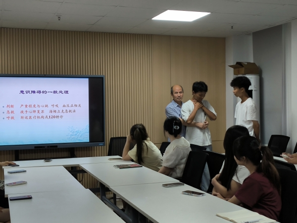 互动环节,沈鸿海解答了青年学生关切的健康问题,讲解了大学生医保政策及其重要意义,指导在场学子学会规范就医。随后,沈鸿海现场展示海姆立克急救法和心肺复苏(CPR)基本操作要领,鼓励学生增强急救意识,学习提升救护能力。