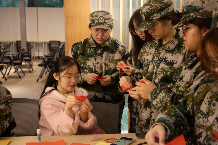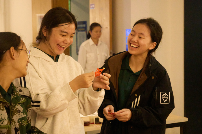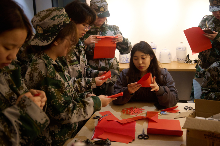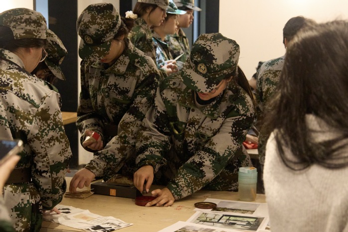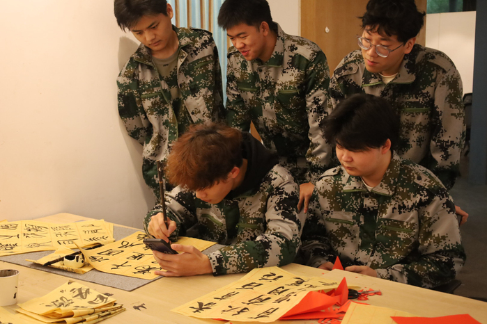 非遗体验区的氛围静谧而庄重。剪纸与木板刻印技艺的师生手把手传授技法,学子们小心翼翼地在红纸上勾勒轮廓、雕琢造型,手持印具蘸取油墨,在印纸上稳稳落下,“祝武职大生日快乐”“笃行致远 不负韶华”的真挚祝福跃然纸上,墨香与匠心交织,让传统文化的温度在指尖传递。学子们举着相机奔跑穿梭,定格下专注的眼神、灿烂的笑容、默契的协作;志愿者连夜剪辑的校庆短片,每一帧都饱含着藏不住的热爱与祝福。
