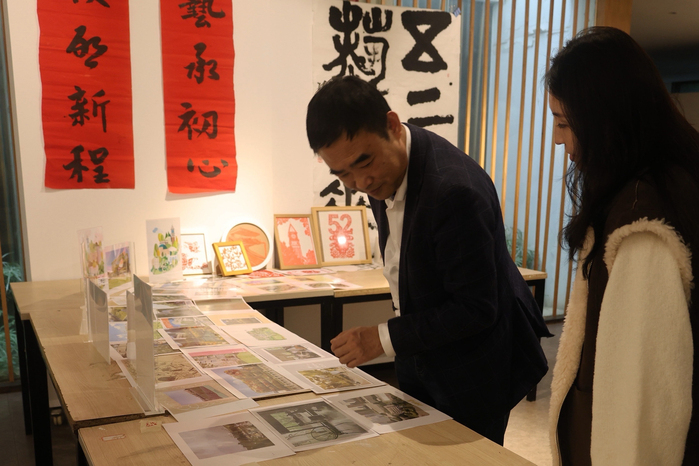 活动现场宛如一幅流动的美育长卷,“校园美景手绘区”“校园影像展示区”“AI创意互动区”“非遗体验区”四大区域错落布局、相映成趣,传统文化的温润底蕴与现代科技的灵动活力在此交融共生。