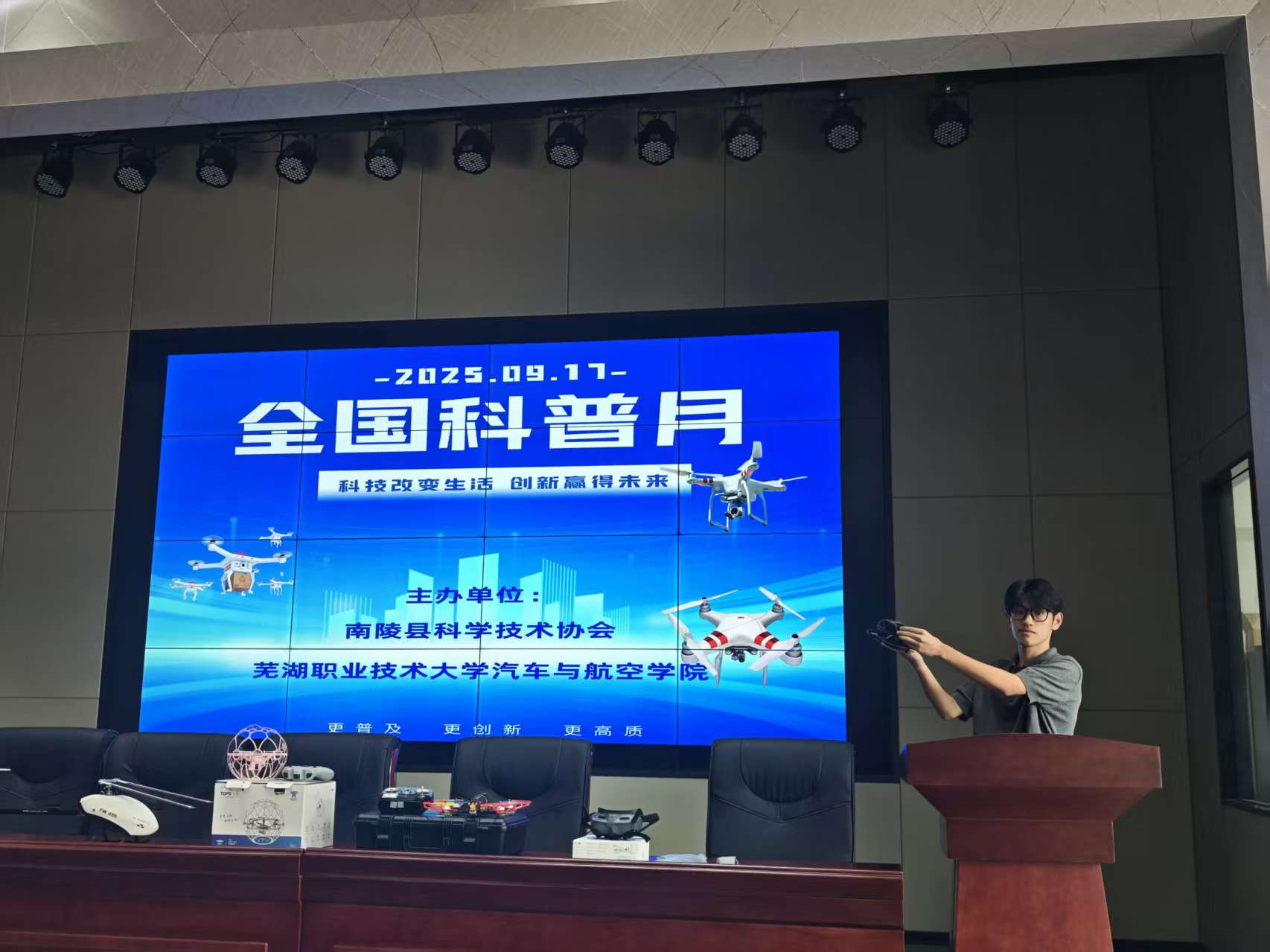 9月17日,芜湖市科技特派员、汽车与航空学院专任教师尹涛受南陵县科学技术协会邀请,带领“智航时代”无人机创新创业协会赴南陵县籍山镇大港社区开展全国科普月活动。师生团队紧扣“科技改变生活 创新赢得未来”的主题,为籍山镇中心小学城南校区的小学生们带来了一场“飞向未来”的无人机公益科普讲座和体验活动。