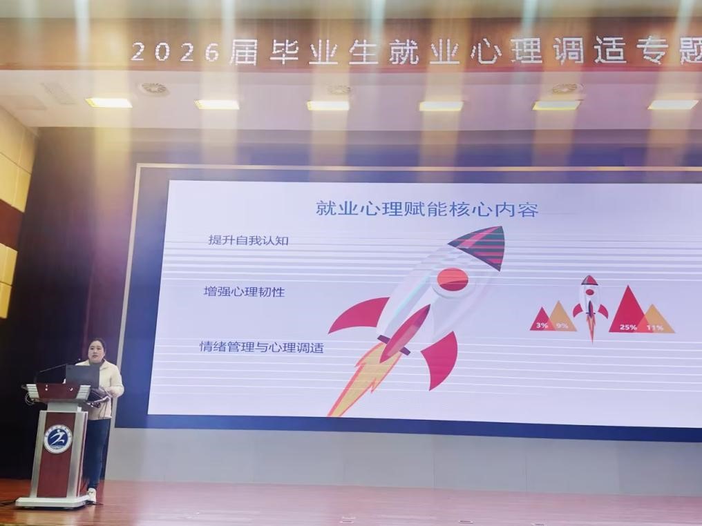 为帮助2026届毕业生平稳度过实习前的焦虑期,树立正确的就业择业观,11月13日下午,我校大学生健康成长指导中心精心策划的“职海启航,从‘心’开始”2026届毕业生就业心理调适专题讲座在文津校区图书馆报告厅举行。本次活动吸引了数百名大三学生踊跃参加。