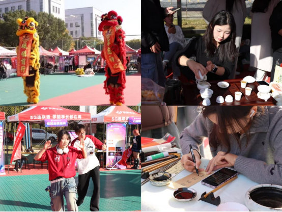 展区内各个社团表演精彩纷呈。舞狮社团学子身着鲜艳狮袍,随铿锵锣鼓灵动腾跃、摇头摆尾,惟妙惟肖的表演引得掌声雷动;中华茶叶爱好者协会带来雅致茶艺,温杯烫盏、分茶敬茶间茶香袅袅,尽显传统文化韵味。舞台两侧,各社团摊位依次排开,创意海报醒目亮眼,摊位前人流涌动,欢声笑语与微风相融,勾勒出热闹的校园图景。