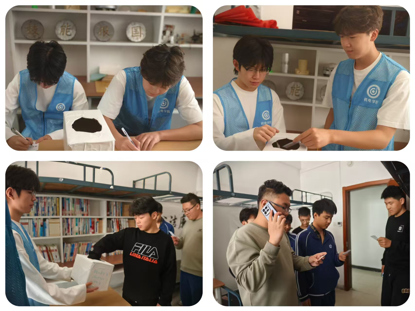 在“大声说出你的爱”环节中,抽中幸运签的同学需完成一场校园告白。活动开始,志愿者们将准备好的字条放在纸箱中供同学们抽取,纸条内包含即时通话、视频寄语等多项内容,抽中“即时通话”的学生在志愿者见证下拨通电话,和母亲唠唠家常;抽到“视频寄语”的学子面对镜头说出“妈妈辛苦了”。来自厚德苑一号楼3613宿舍的李坤鹏,平素沉默寡言,但听到母亲咳嗽声后脱口而出“记得按时吃药”;同宿舍素来活泼的孔祥卿,却在和妈妈喊出“我爱你”时羞红了脸。