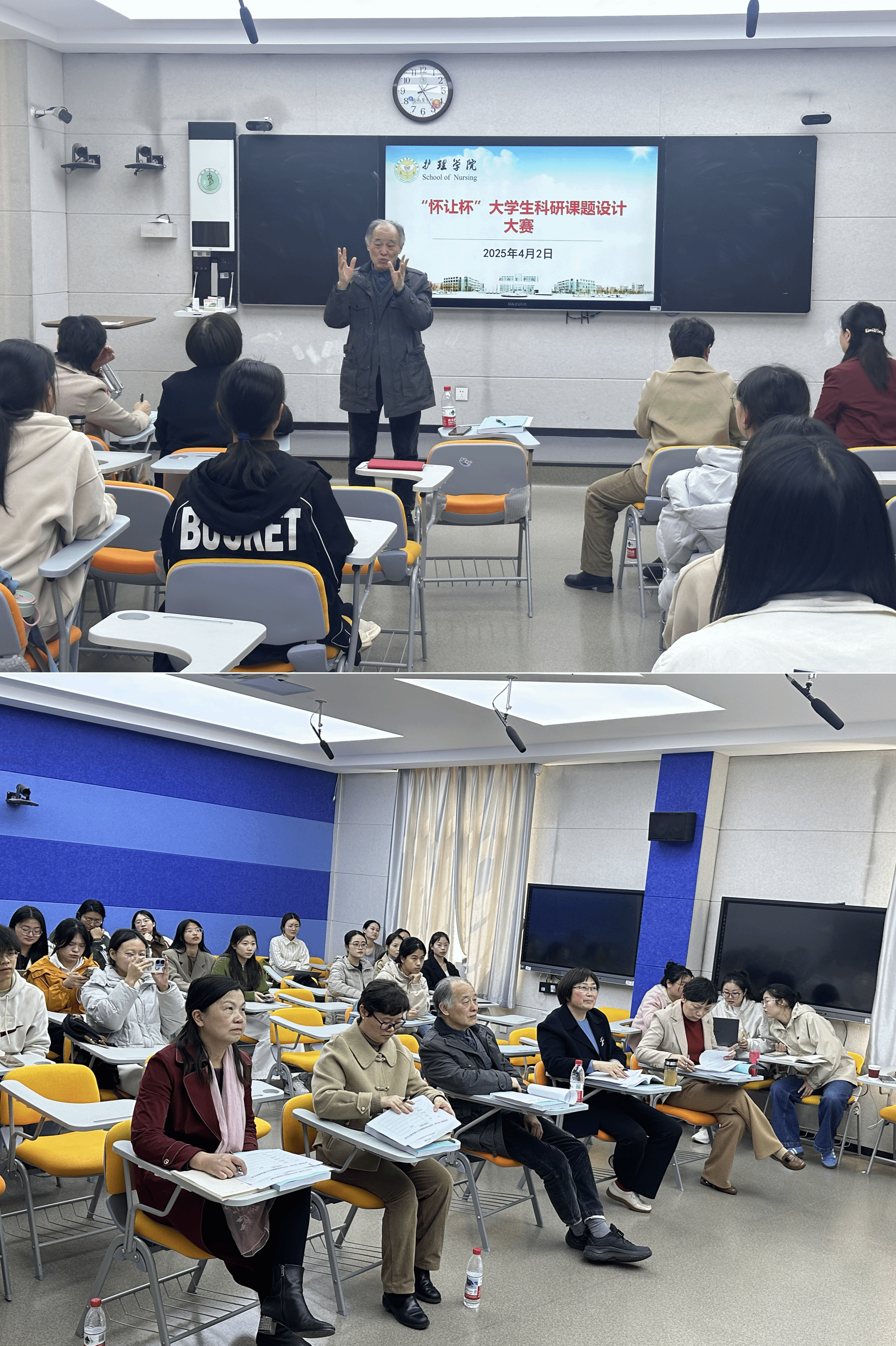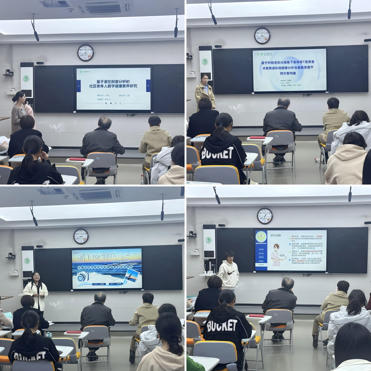 在学院的广泛宣传与积极动员下,护理本科生、研究生均踊跃报名,最终有21名选手进入现场汇报比赛。汇报过程中,选手们利用精心制作的PPT,详细阐述各自科研项目的研究背景、设计思路、实施方案以及预期成果。参赛项目紧密围绕临床实际需求,从学科交叉融合、人文关怀等多元视角出发,广泛涉及心理健康、特殊群体关怀、应用分析、模型构建、健康科普、护理干预等多个前沿领域,彰显了学院学子的学术研究热情以及创新思维能力。