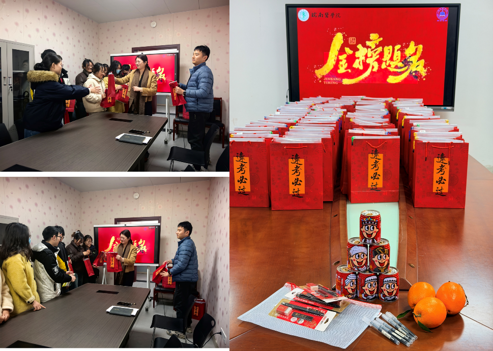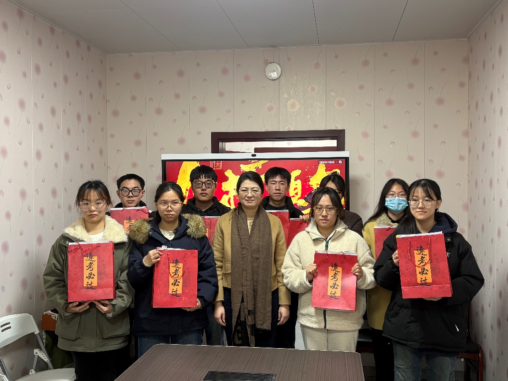 学院精心准备了四百余份考研大礼包,内含中性笔、涂卡笔等应试文具,象征“心想事成”的橙子、寓意“考运兴旺”的牛奶,从实用需求到心理慰藉形成全方位保障。院党委书记李娜和学院老师们一同走进一站式学生社区,将满载关怀的贺卡和考研“暖心套装”纷纷送到考研学子手中。一句句贴心叮嘱、一声声真诚鼓励,给考研学子的备考冲刺增添了融融暖意,助力他们以最佳状态奔赴考场。