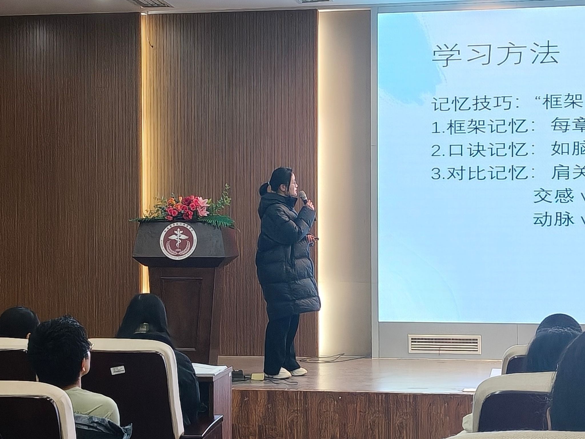 分享会上,四位同学结合自身学习生活的宝贵经验,倾囊相授实用技巧。吴秋雨同学聚焦系统解剖学,提炼出“框架搭建 + 口诀记忆 + 对比辨析”的高效学习法,建议同学们做好重点内容梳理,并分享了优质学习资源。文善菲同学针对医学细胞生物学知识点细碎的特点,指导大家紧扣老师划定重点、实验指导手册和习题集开展系统性复习,同时强调联想记忆法与目标计划管理的重要性,助力提升学习效率。王雨彤同学结合组织学与胚胎学侧重记忆的学科特性,着重推荐“汉堡学习法”等实用工具,为同学们突破记忆难关提供新思路。徐美情同学倡导资料共享、笔记互通的互助模式,携手营造友爱向上的学习氛围与勤学善思的优良学风。