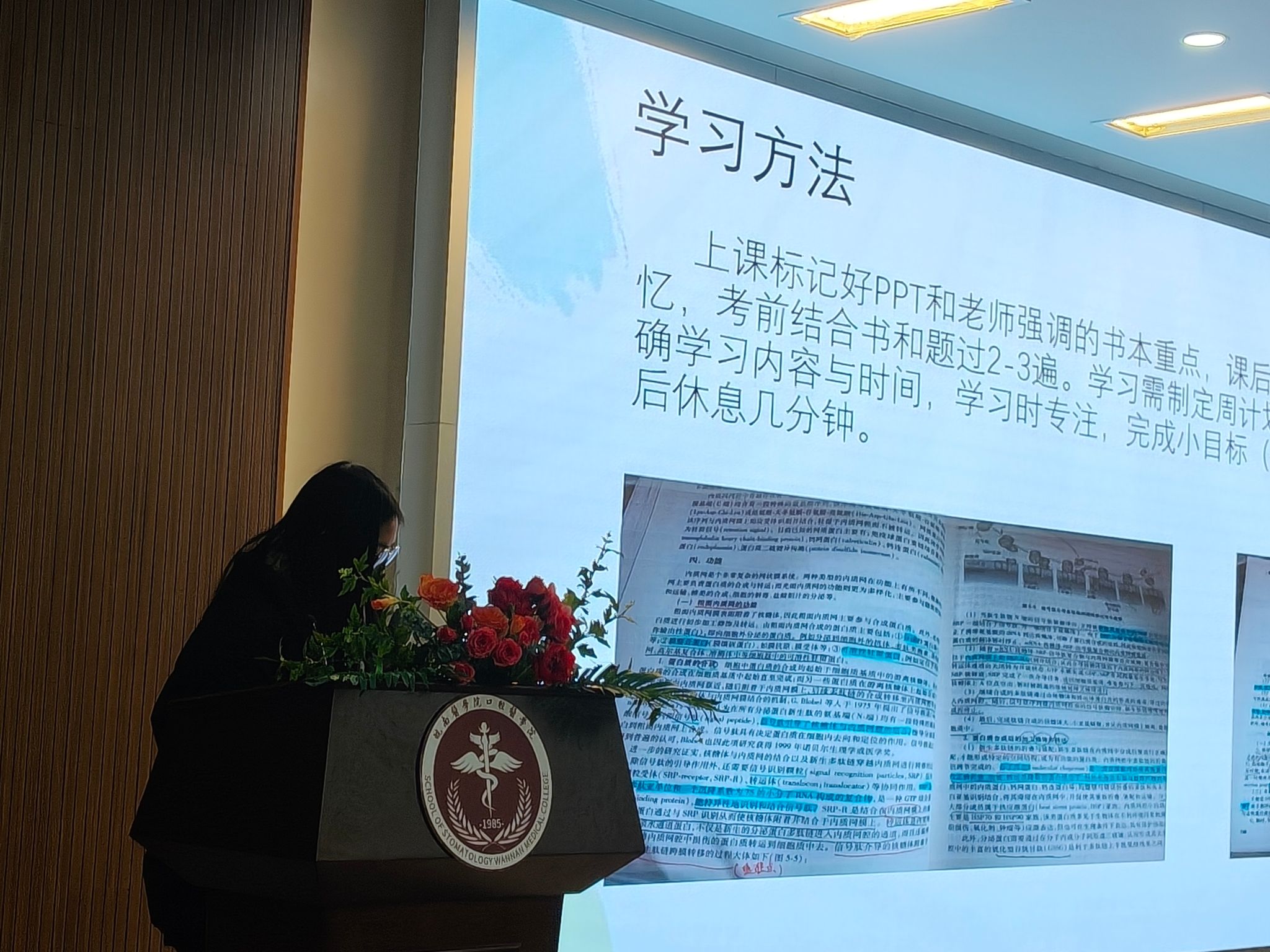 为发挥榜样引领作用,涵养优良学风,助力新生夯实学业基础,口腔医学院于12月25日在学院五楼会议室开展学业帮扶朋辈经验交流会,邀请学院2024级8318“全奖学金宿舍”吴秋雨、文善菲、王雨彤、徐美情四名同学,围绕系统解剖学、组织学与胚胎学、医学细胞生物学三门医学基础核心课程开展专题分享。