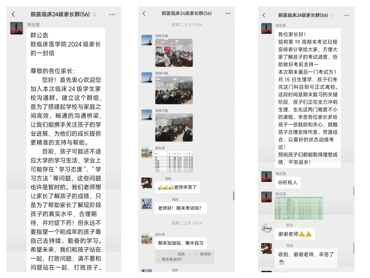 为进一步强化家校协同育人机制,促进学生的全面发展与成长,临床医学院2024级辅导员聚焦学业困难学生群体,通过电话沟通、微信交流等方式搭建家校沟通的“连心桥”,交流过程中,辅导员详细向家长反馈学生在校的课堂出勤、课程作业、专业知识掌握等学习情况,告知期末各项考试的时间节点与备考要求,针对学生存在的学习短板、备考难点提出建设性意见,希望学生家长共同关注学生学业进展,同时关注学生心理健康状态,助力每一位学子夯实学业根基、突破学习瓶颈,重塑信心,稳步回归学业正轨。