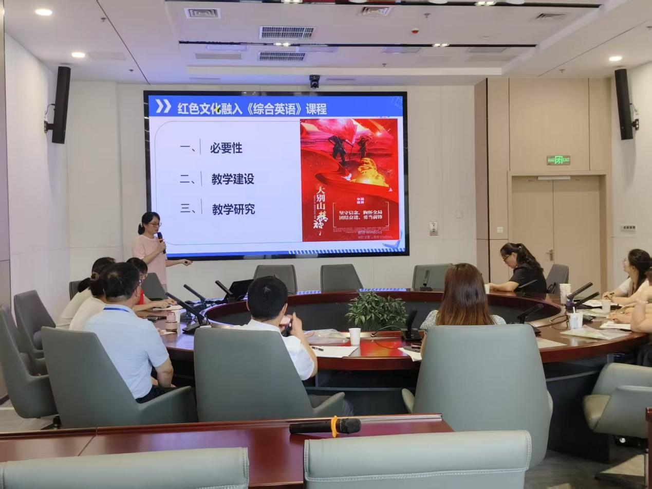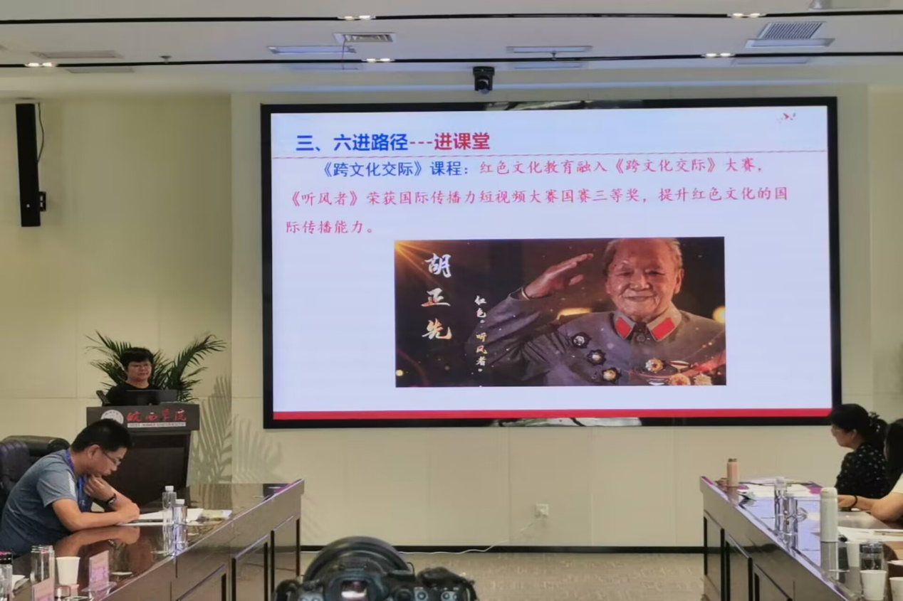 最后,外国语学院院长助理李曼曼分享了皖西红色文化融入英语课程思政的“六进”路径,即进课堂、进教材、进平台、进项目、进活动、进媒体,并展示了实践成效。