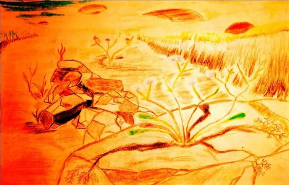这幅画描绘的是作者在山西运城的所见。用开满鲜花的野草代替高大的古桑,用破碎的砖头取代开裂的岩石。整幅画色彩柔和,用颜色的明暗与线条的变换将观看者的目光引向画中空白的地平线,以使观察者暂时放下已有的概念与成见。应用这一浅催眠原理达到艺术享受的同时使观察者感受到更深层次的喜悦,体会到生命与自然的神奇力量。