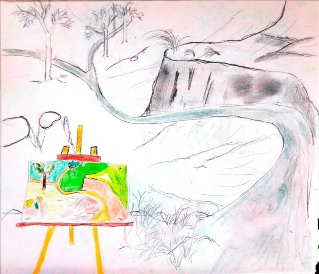 本幅作品主体为素描,表现环境的荒凉,仅代表绘画者心境的画架施以彩色,以凸显画者的内心与环境的巨大反差。画架以鲜艳的色彩吸引目光,环境部分以线条和色阶吸引眼球,使画面整体平衡。兼顾心理学寓意和艺术体验。