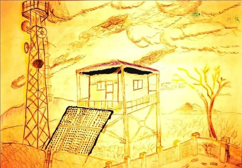 这幅画作记录的是作者决定专业选择时,在山上见到的实景。这里同时出现了两个候选专业的代表物:微波中继站和光伏电池组。