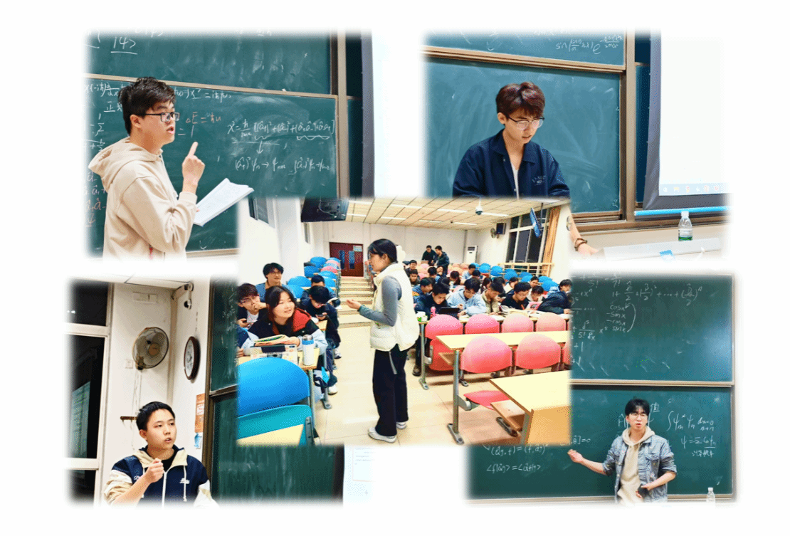 第三层是长生互动促深化。研学学长每两周组织一次讨论课,与课程同步推进。课上采用单人或2-3人协作的方式抽签领题,进行三十分钟讨论。课堂氛围轻松自由,学生可随意走动、提问。讨论结束后,学生上台讲题,研学学长给予精准点评与细致补充。在这种平等的互动中,研学学长帮助学生巩固核心知识点,并通过引入前沿案例与科研场景,引导学生将书本知识与科研实践相结合,实现从“疑难困惑”到“融会贯通”的转变。
