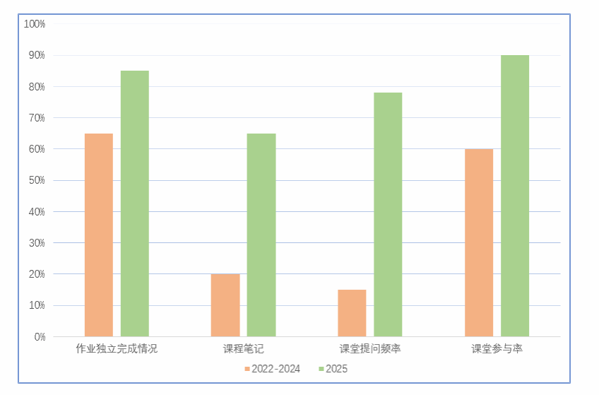 课堂“活”了,学生“动”了。现在,翻开学生的笔记本,密密麻麻的“疑难标注”和“思路备注”笔记占到了65%,而过去这个比例仅为20%;课后作业的独立完成率也从60%提高到85%。如今再走进课堂,不再是“死气沉沉”,提问声此起彼伏,提问频次比往届增加了2.5倍,问题的质量也从单纯的“公式是什么”的公式记忆类问题转向了“为什么这样推理”的逻辑质疑类问题。