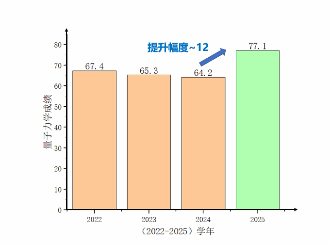 但本学期末,《电子材料理论物理Ⅱ》交出了一份亮眼的成绩单。90位学生的课程考核成绩均分为77.1分,相较于2022-2024年间该课程65分左右的平均成绩,提升了12分,提升幅度达19%!