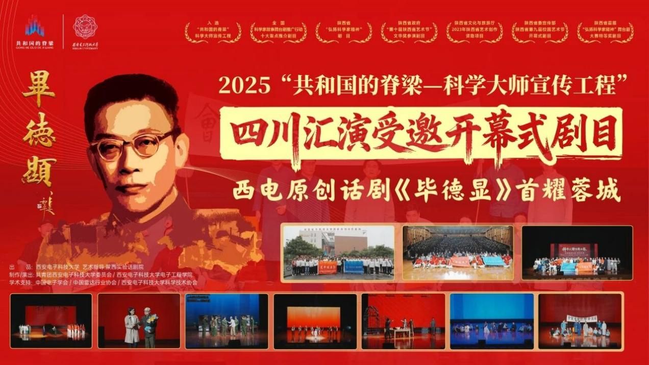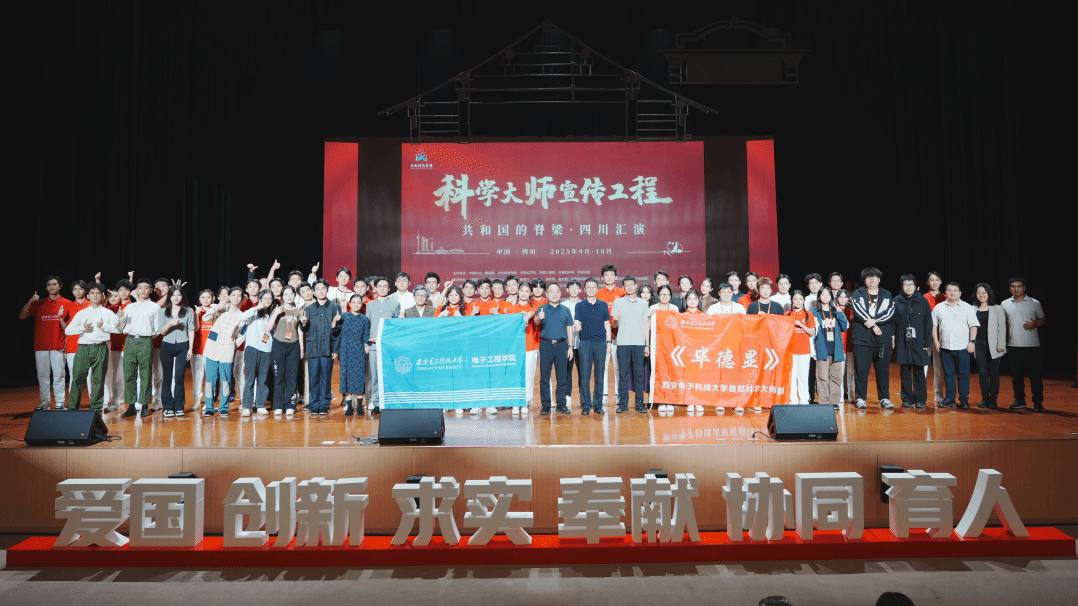 西电新闻网讯(通讯员 张玲 韩旭)9月23日晚,在“共和国的脊梁——科学大师名校宣传工程”四川汇演活动的开幕舞台上,由电子工程学院倾力创排的西电原创科学大师剧《毕德显》作为开幕大戏上演。学院党委书记杨光暐及相关领导、辅导员赴成都组织参加此次演出活动。期间为成都相关高校和干部群众奉献三场精彩演出,为现场观众呈现了一堂沉浸式“思政大课”,赢得了与会领导、各界嘉宾及现场师生的一致好评与热烈反响。
