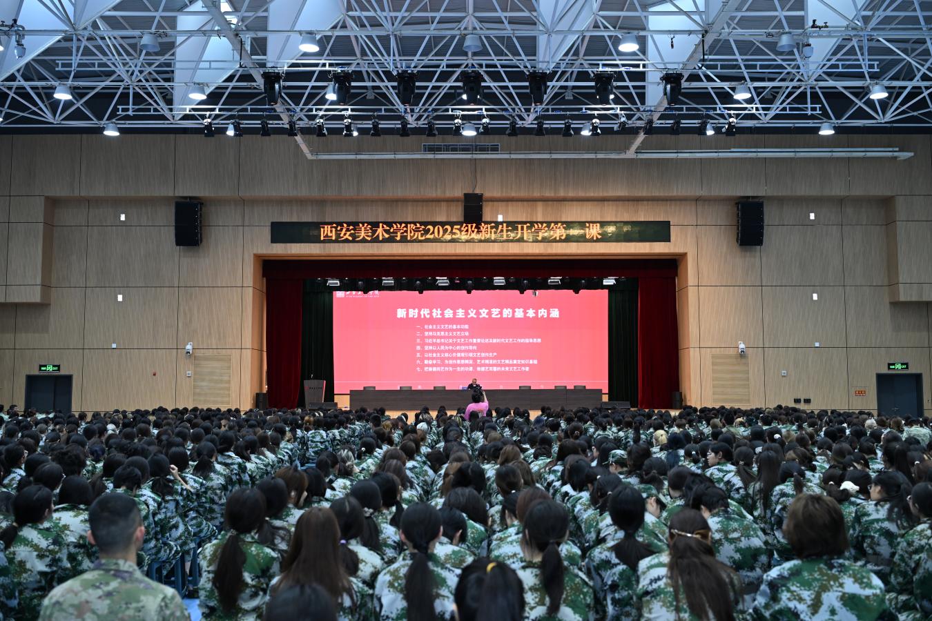 9月22日下午,党委书记丁巨涛在长安校区体育馆以《新时代社会主义文艺的基本内涵》为题,为2025级本科新生讲授开学第一课。