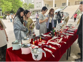 2025年4月16日,传媒与设计学院笃行学生社区在10号楼广场举办"违规电器展,认清隐患勿冒险,携手护校保平安"的活动,通过对违禁品的展示以起到警示教育强化学生安全意识的作用。学院党委副书记南斌红带领全体辅导员,与10号楼所有宿舍长共同参与这场安全教育活动。
