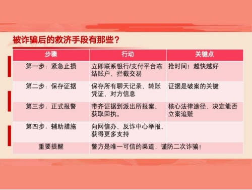 宣讲团成员通过救济四步法帮助同学们理清思路,沉着冷静地寻找救济途径,强化同学们的证据留存意识以及预防处于着急心理下再次被骗的可能。