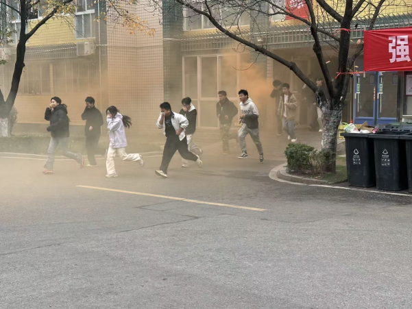 随着演练信号的发出,学校保卫部在10号公寓楼门口点燃烟雾弹,模拟真实火情。瞬间,烟雾弥漫在公寓楼入口及楼道区域。同学们发现火情后,在辅导员老师的有序引导下,迅速弯腰低姿、捂住口鼻,沿着预定疏散路线,从楼内正门及两侧消防通道快速撤离。整个疏散过程中,学生们听从指挥、有序避让,仅用数分钟便全部安全抵达至指定集合点,疏散演练取得圆满成功。