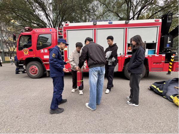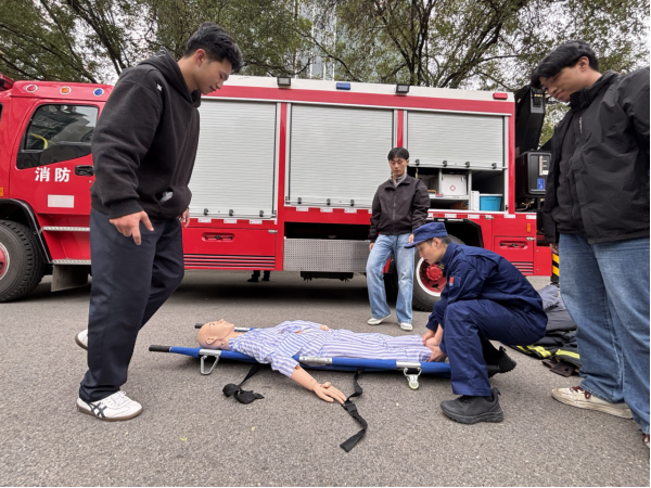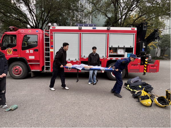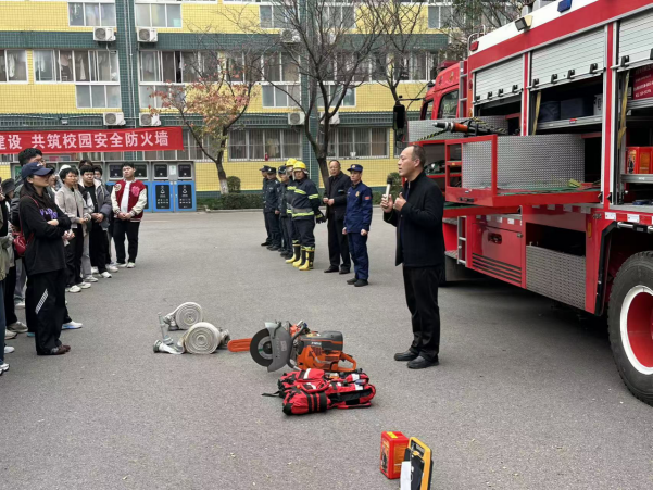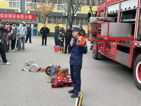 演练结束后,学校特邀请长安消防大队韦曲南站消防中队张辉涛教官为同学们进行消防安全知识科普。张教官详细讲解了干粉灭火器的“提、拔、握、压”使用步骤,重点强调了灭火时的安全距离和站位技巧;同时,针对救援消防装备的功能特点、救护担架的正确抬放姿势及伤员转运注意事项等内容进行了全面科普,鼓励学生们亲自上手操作体验,切实将消防安全知识转化为实际应用能力。
