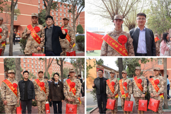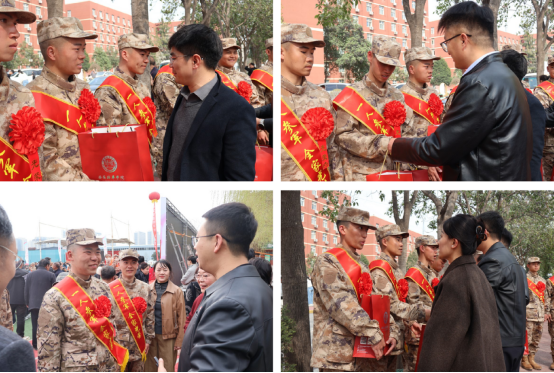 党委学工部部长权勇太,智能科学与工程学院党委书记王林,医学院党委副书记王江茹,文学院党委副书记王伟平,传媒与设计学院党委副书记坚强为新兵送上入伍纪念品及祝福。