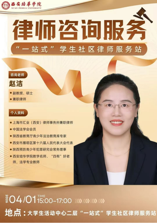 本次驻场咨询律师由学校法学专业副教授、上海市汇业(西安)律师事务所兼职律师赵洁老师坐诊。赵洁老师是中国法学会会员、陕西省教育厅青少年法治教育库专家、西安市雁塔区第十六届人民代表大会代表,同时也是学校教学名师、“四有”好老师,拥有深厚的法学理论功底与丰富的青少年法治服务经验。