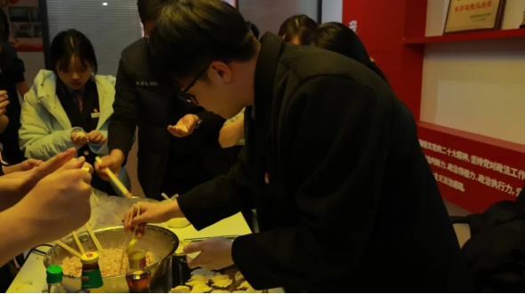 活动现场气氛温暖亲切,师生们分工协作,动手实践,何思源、郑凯一老师主动示范,从擀皮的要领到捏合的技巧,一步步耐心讲解,学生们则认真观摩、积极尝试,逐渐从生疏到熟练,掌握了包饺子的要领。大家边包边交流家乡的冬至习俗与校园趣事,温暖的节气氛围与师生情谊也在指尖上传递,师生间的距离悄然拉近。